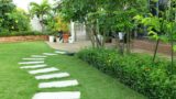 玄関までのアプローチに沿って寄せ植えを配置すると、自然な「誘導ライン」が生まれます。